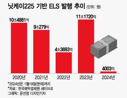 현재 닛케이225 ELS 발행 규모는 코스피200 ELS(3424억원) 발행액을 넘었다. 코스피200(157개)보다 발행 종목도 많다. 2020년 이후 줄곧 코스피200 ELS 발행액이 닛케이225 ELS 발행액보다 많았는데 역전했다.