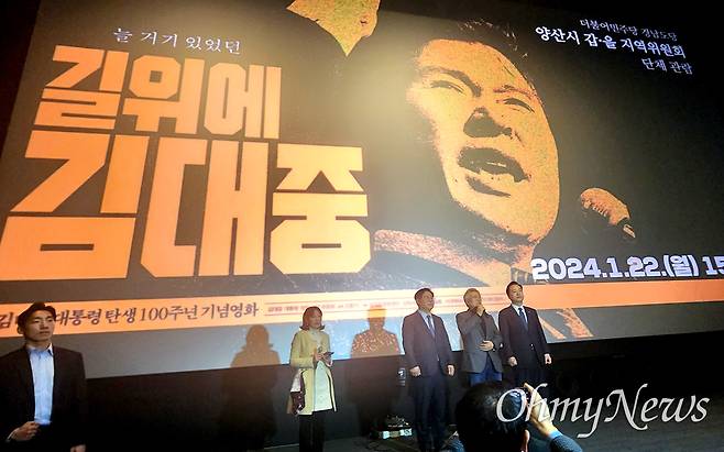 | ▲ 더불어민주당 양산갑·을 지역위원회는 문재인 전 대통령이 참석한 가운데 22일 오후 3시 메가박스 양산증산점에서 김대중 전 대통령의 일생을 다룬 영화 <길 위에 김대중>을 단체관람했다. |