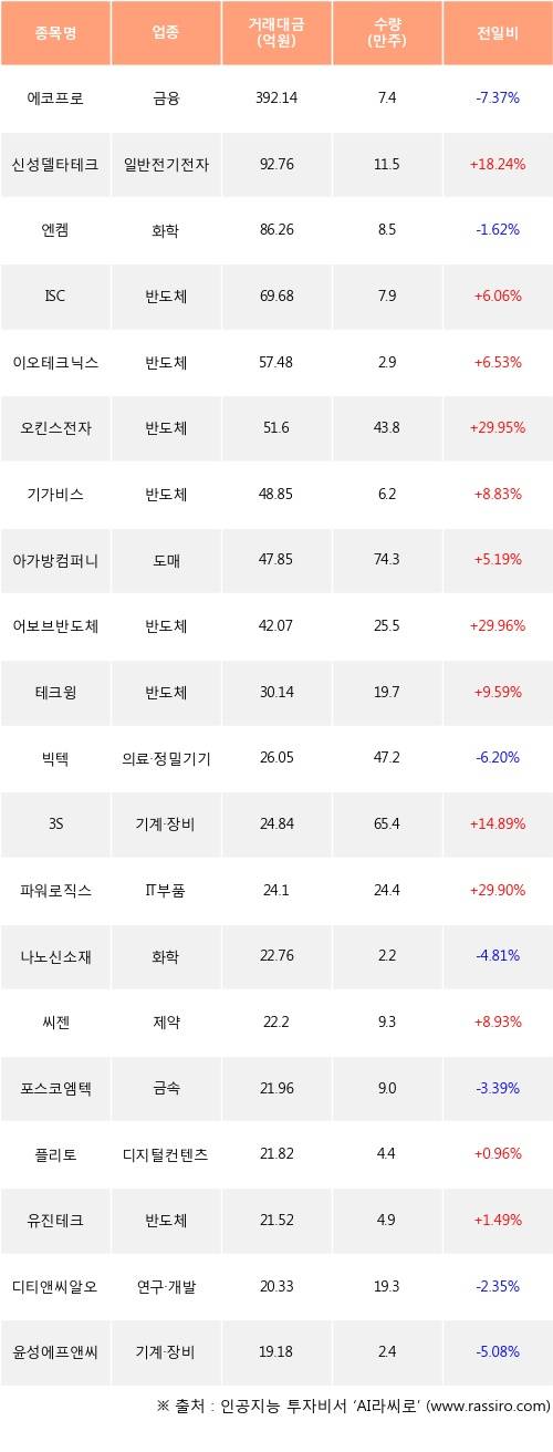 신성델타테크, ISC, 이오테크닉스 등은 전일 대비 주가가 상승했고, 에코프로, 엔켐, 빅텍 등은 주가가 하락했다.