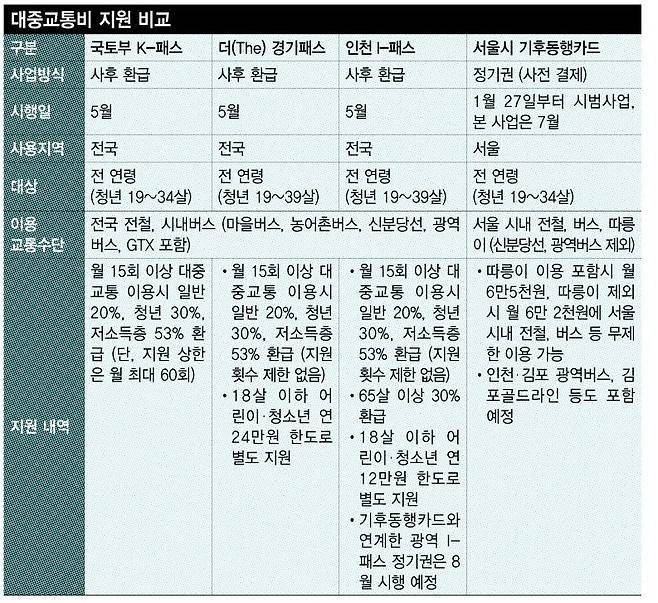 정부와 지자체가 내놓은 대중교통비 지원사업은 사업 방식, 지원 범위 등이 상이해 각자 이용하는 대중교통 수단과 횟수 등을 따져본 뒤 선택해야 한다. 우선 국토부가 5월에 시행하는 케이패스는 전국 17개 시도에서 시내버스와 전철 등 대중교통을 월 15회 이상 이용할 경우 지출 금액의 일정 비율(일반인 20%, 청년층 30%, 저소득층 53%)을 다음달에 돌려받는 교통카드다. 마을버스, 농어촌버스, 신분당선, 광역버스, 수도권 광역급행철도(GTX)에서도 모두 쓸 수 있다. 단, 월 최대 60회로 지원 범위 상한이 존재한다. 청년층은 만 19~34살로 규정했다. 수도권에 살지 않고 광역 단위를 대중교통으로 오가는 이용자들에게 좋다.