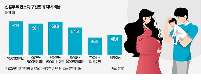 2022년 11월 1일 기준 혼인 신고한 지 5년 이하인 부부의 소득 구간별 자녀 현황을 조사한 결과 연소득 1000만원 미만인 부부의 유자녀 비율이 60.1%로 가장 높았다. 연소득 7000만~1억원 미만 부부는 46.2%만 아이가 있었다. 연소득 1억원 이상 부부도 유자녀 비율이 48.4%로 아이가 없는 집이 더 많았다. 자녀가 둘 이상인 부부의 비율도 연소득 1000만원 미만 부부가 15.1%로 가장 높았고 연소득 1억원 이상 부부는 7.9%만 둘째가 있었다.