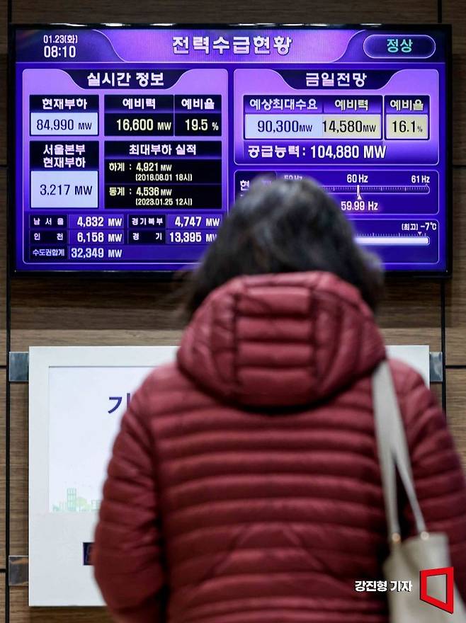 서울 등 수도권 지역에 한파주의보가 발령된 23일 서울 중구 한국전력 서울본부 모니터에 전력수급현황이 표시돼 있다.