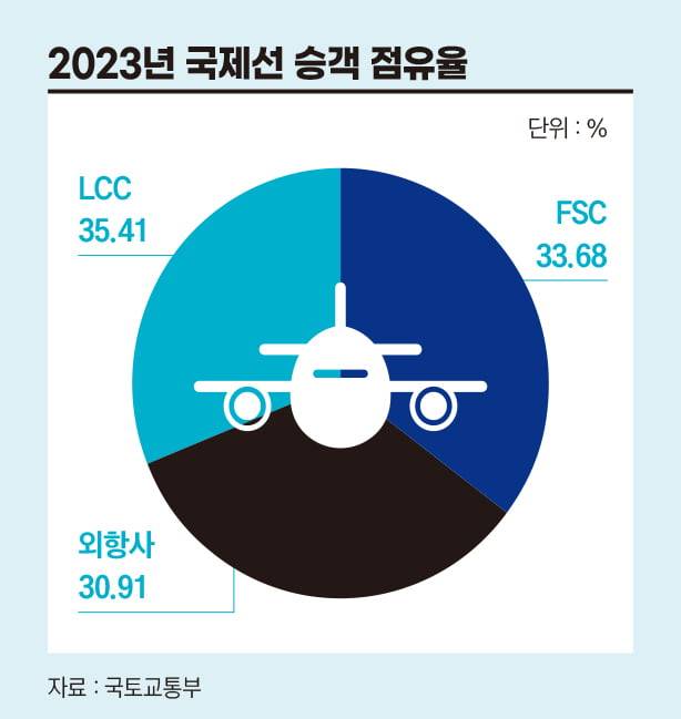 종전 LCC의 최대 점유율은 코로나19 확산 직전인 2019년 29.5%였다. 이때 FSC 2개사의 점유율은 37.5%로 LCC를 훨씬 웃돌았다. 그러나 이제는 오히려 FSC가 LCC를 추격해야 하는 상황이 됐다.