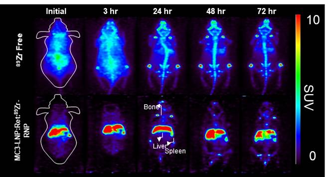 | ▲ 지르코늄-89(89Zr)와 합성한 크리스퍼 단백질이 간경화 질환을 가진 실험용 쥐에 투여되어 72시간동안 추적한 PET 영상자료. 상단패널 = 89Zr만 정맥주사 한 경우에는 전체적으로 분포함을 알 수 있음. 하단패널 = 지질 나노입자로 둘러싼 89Zr-LbCas12a 단백질이 간부위에 분포되어 있음을 알려줌. |