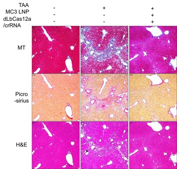 | ▲ 지르코늄-89가 도입된 콜라겐 전사 억제 크리스퍼 단백질이 마우스에 정맥주사 되어 콜라겐 축적을 억제시켰음을 보여주는 조직학적 자료. 왼쪽열 = 정상 마우스의 간염색 사진 / 중간열 = 간독성이 발생하여 간경화가 진행된 마우스의 간염색 사진 / 오른쪽열 = 콜라겐 증식 억제 크리스퍼 단백질을 처리한 마우스의 간염색 사진 |
