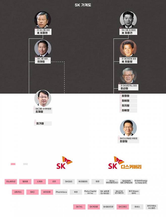 최종건 회장이 이른 나이에 폐암으로 사망해서 아들이 아닌, 동생에게 경영권이 갔는데요. 최종현 회장이 2대 회장이었고, 최종현 회장 사후엔 그 장남인 최태원 회장이 그 뒤를 이었어요.