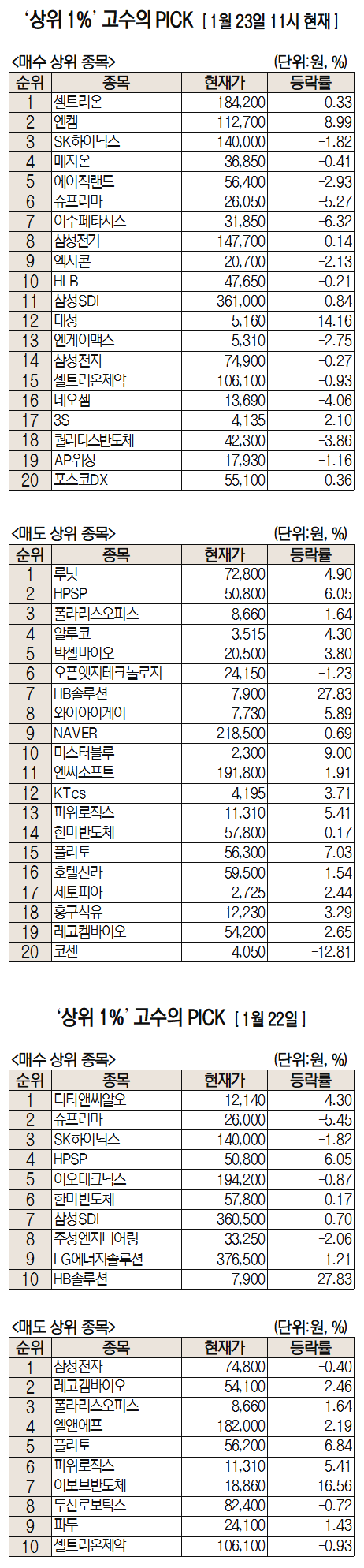 미래에셋증권은 자사 고객 중에서 지난 1개월간 수익률 상위 1% 투자자들의 매매 종목을 집계해 실시간·전일·최근 5일 기준으로 모바일트레이딩시스템(MTS)상에서 공개하고 있다. 이 통계 데이터는 미래에셋증권의 의견과 무관한 단순 정보 안내이며 각각의 투자자 개인에게 맞는 투자 또는 수익 달성을 보장하지 않는다. 또 테마주 관련종목은 이상 급등락 가능성이 있으므로 유의해야 한다.