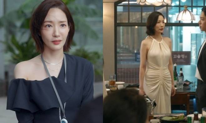 지난 8일 방영된 3회에서는 박민영이 고깃집에서 열린 동창회에 시상식을 방불케하는 홀터넥 화이트 롱 드레스를 입고 나타났다. 또 16일 방송된 6회에서 그가 한쪽 어깨가 과감하게 드러난 오프숄더 블라우스를 입고 회사에 출근하는 모습이 나와 놀라움을 자아냈다.