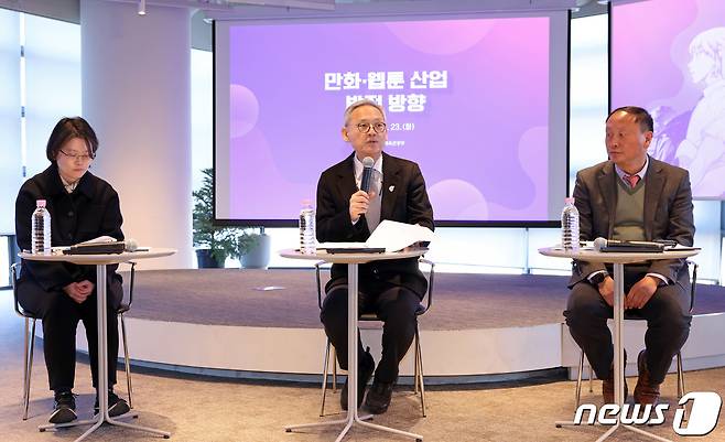 (서울=뉴스1) = 유인촌 문화체육관광부 장관이 23일 서울 종로구 아트코리아랩에서 만화·웹툰 산업 발전 방향을 발표하고 있다. (문화체육관광부 제공) 2024.1.23/뉴스1