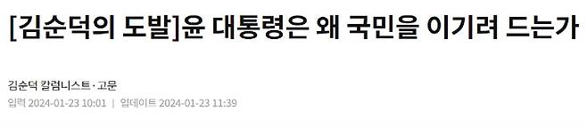 | ▲ 김순덕 <동아일보> 고문 또한 23일 <동아일보> 디지털콘텐츠인 '김순덕의 도발'에서 "윤 대통령은 왜 국민을 이기려 드는가"라는 제목의 글을 기고했다. |