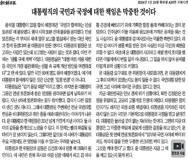 "대통령직의 국민과 국정에 대한 책임은 막중한 것"이라는 제목의 23일 사설에서 "대통령과 한 위원장의 갈등은 김건희 여사 명품백 의혹이 원인"이라고 규정하면서 "윤 대통령과 김 여사로는 억울한 측면이 있다"라면서도 "애초에 윤 대통령이 사과하고 재발 방지 조치를 했다면 이렇게까지 번질 일이 아니었다"라며 윤 대통령의 대응이 잘못이라고 지적했다.