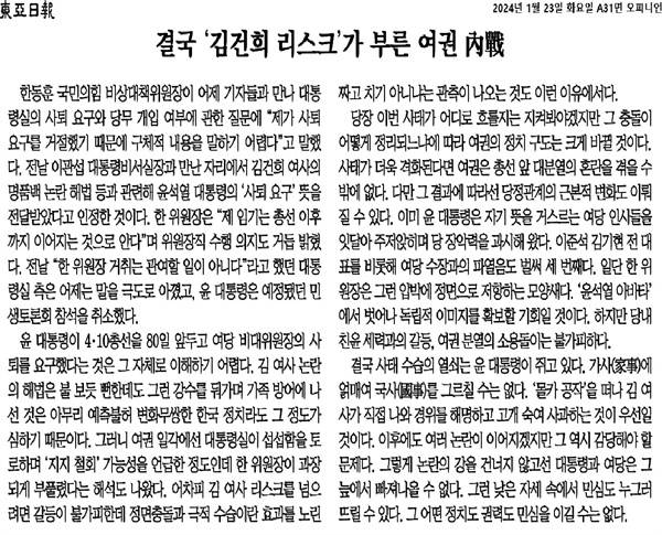 <동아일보> 또한 "결국 '김건희 리스크'가 부른 여권 내전"이라는 제목의 23일 사설에서 윤 대통령의 한 위원장 사퇴 요구에 대해 "그 자체로 이해하기 어렵다"라며 "김 여사 논란의 해법은 불 보듯 뻔한데도 그런 강수를 둬가며 가족 방어에 나선 것은 아무리 예측불허 변화무쌍한 한국 정치라도 그 정도가 심하기 때문"이라고 강하게 비판했다.