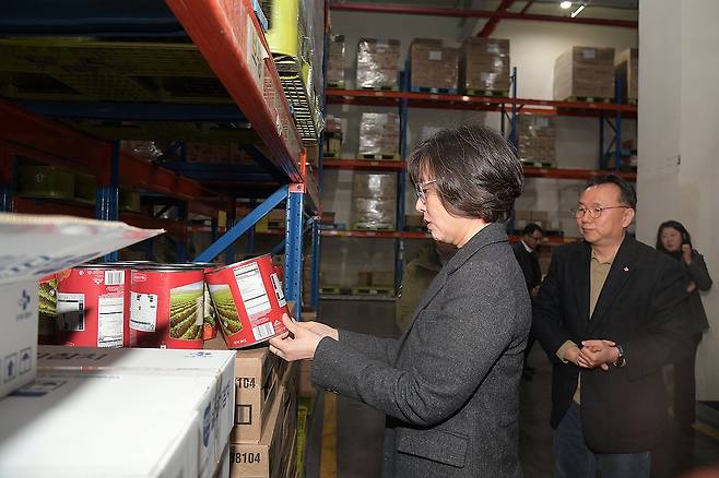 (서울=연합뉴스) 김유미 식품의약품안전처 차장이 23일 경기 이천시 CJ프레시웨이 물류센터를 방문해 수입 식품을 살펴보고 있다. 2024.1.23 [식품의약품안전처 제공. 재판매 및 DB 금지]