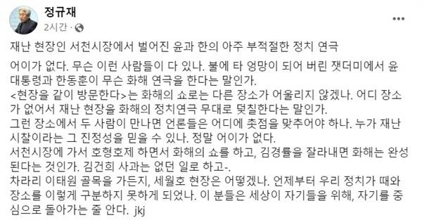 | ▲ 보수 논객인 정규재 전 <한국경제신문> 논설위원 또한 자신의 페이스북에 "재난 현장인 서천시장에서 벌어진 윤과 한의 아주 부적절한 정치 연극"이라며 "어이가 없다. 무슨 이런 사람들이 다 있나. 불에 타 엉망이 되어 버린 잿더미에서 윤 대통령과 한동훈이 무슨 화해 연극을 한다는 말인가"라고 지적했다. |