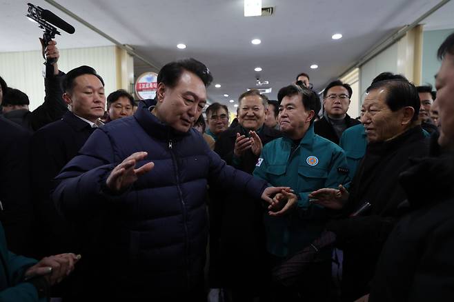 | ▲ 23일 윤석열 대통령이 화재가 난 충남 서천 수산물특화시장을 찾아 사람들과 이야기를 나누고 있다. 맨 오른쪽 남성은 오세옥 충남도의원. |