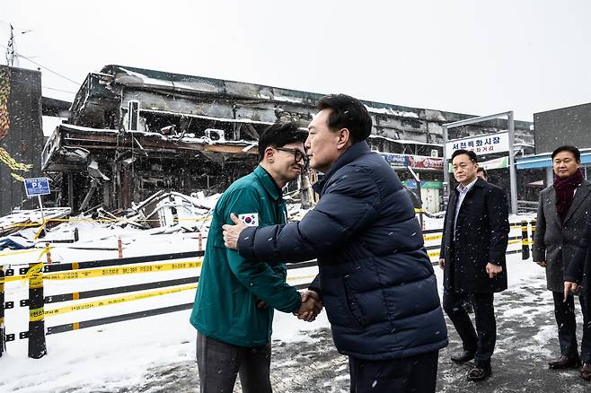 | ▲ 윤석열 대통령, 한동훈 비대위원장과 함께 서천시장 화재 현장 점검 윤석열 대통령이 23일 충남 서천군 서천읍 서천특화시장 화재 현장에서 국민의힘 한동훈 비상대책위원장과 만나 함께 현장을 점검하고 있다. |