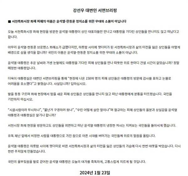 강선우 더불어민주당 대변인은 '서천특화시장 화재 피해의 아픔은 윤석열-한동훈 정치쇼를 위한 무대와 소품이 아닙니다'라는 제목의 논평을 통해 "국민의 아픔은 윤석열-한동훈 정치쇼를 위한 무대와 소품이 아니다"라고 비판했다.