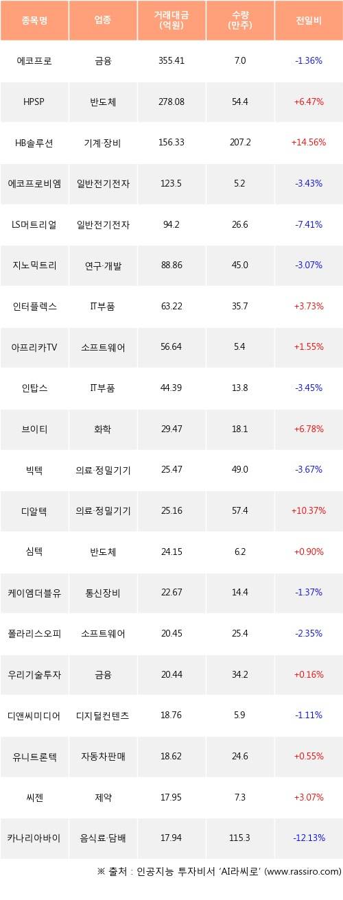 HPSP, HB솔루션, 인터플렉스 등은 전일 대비 주가가 상승했고, 에코프로, 에코프로비엠, LS머트리얼즈 등은 주가가 하락했다.
