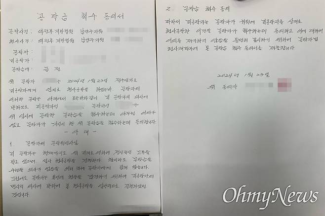 | ▲ '바리캉 폭행 사건' 가해자가 공탁금을 낸 것을 확인한 23일, 피해자 쪽에서 공탁금 수령 의사가 없다는 의사를 담아 법원에 제출한 공탁금 회수 동의서. |