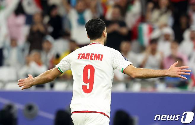 (알라이얀(카타르)=뉴스1) 김성진 기자 = 이란 메흐디 타레미가 23일(현지시간) 카타르 알라이얀 에듀케이션 시티 스타디움에서 열린 2023 아시아축구연맹(AFC) 카타르 아시안컵 조별리그 B조 조별리그 3차전 이란과 아랍에미리트의 경기에서 선제골을 넣은 후 세리머니를 하고 있다. 2024.1.24/뉴스1