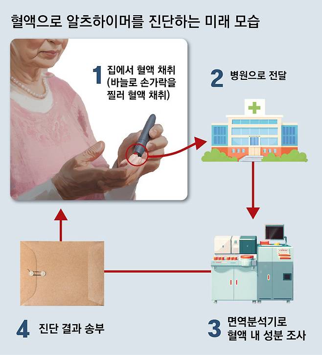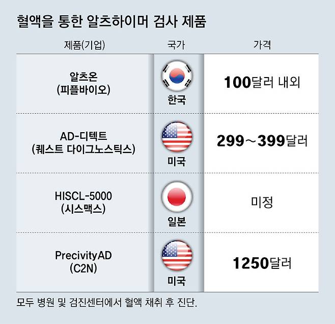 현재 각국에선 알츠하이머 진단 제품 개발 경쟁이 한창이다. 미국에서는 지난해 퀘스트 다이어그노스틱스가 ‘AD-디텍트’라는 진단 키트를 출시했다. 가까운 진단검사 센터에서 채혈을 한 뒤 온라인으로 검사 결과를 받아 보는 방식이다. 다만 정확도가 낮아 널리 사용되진 않는 것으로 알려졌다.