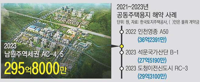 23일 경향신문이 박상혁 더불어민주당 의원실을 통해 받은 LH 연체대금 자료를 보면 2023년 한 해 동안 공공택지를 분양받은 뒤 계약을 해지한 사업장은 남원주 역세권 AC4·5, 석문국가산단 B-1, 도청이전신도시 RC-3 등 총 3곳이다. 날린 계약금만 총 352억629만원에 달한다.