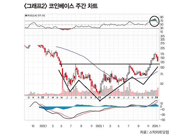 "코인베이스 주간차트를 보면 2022년 5월에서 지난해 11월말에 걸쳐 역머리어깨형을 완성했다(그래프2 참조). 이후 거래량이 증가하면서 중기적으로 상승세로 전환했다. 지난해 12월말까지 8주 연속 상승한 이후 조정을 보이고 있다. 주가 고점에서 나타난 전형적인 조정신호로 RSI(상대강도지수)와 MACD 등 보조지표들도 하락전환하고 있다."