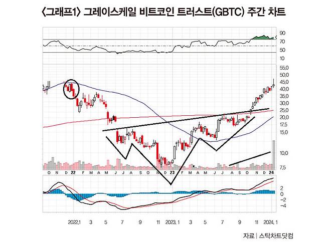 "GBTC 주간차트를 보면 2022년 6월 이후 지난해 10월 중순까지 변형된 역머리어깨형이 완성됐다(그래프1 참조). 패턴 완성 후 전형적인 상승흐름이 이어지고 있다. 올해 1월에는 단기 급등에 따른 차익실현 욕구와 신규 매수가 증가하면서 활발한 손바뀜 현상이 나타나고 있다. 단기 과열권에 진입한 것으로 보인다. GBTC의 1월 둘째 주 주봉은 작은 몸통이면서 윗꼬리와 아랫꼬리가 길게 나타났다. 당분간 단기 상승에 따른 조정시간이 필요해 보인다."