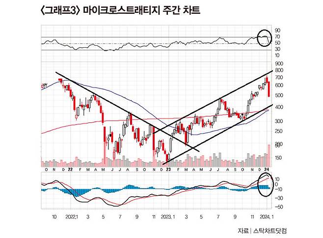 "마이크로스트래티지 주식은 투자 수익률 측면에서 비트코인보다 더 큰 성과를 보여주고 있다. 마이크로스트래티지의 주간차트를 보면 2021년 11월 이후 지속된 중기 하락추세선을 지난해 1월 상향 돌파했다(그래프3 참조). 이후 단기 상승 후 조정을 보였으나 중기 하락추세선으로 복귀하지 않고 새로운 상승추세대를 형성하면서 상승흐름을 이어가고 있다. 지난해 12월말 상승추세대 상단에서 저항을 받으면서 주가는 조정을 보이고 있으며 추가 조정도 예상된다."