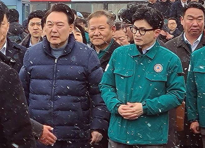 | ▲ 화재현장 방문한 윤석열 대통령과 한동훈 비대위원장 윤석열 대통령과 국민의힘 한동훈 비상대책위원장이 23일 오후 충남 서천특화시장 화재 현장을 둘러보고 있다. |