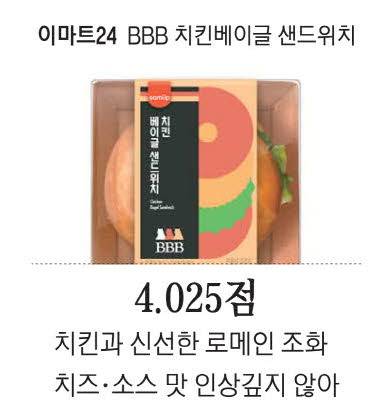 재료의 조화로움이 호평받은 상품도 있었다. 이마트24 BBB치킨베이글 샌드위치(4200원)다. 이 샌드위치는 한남동 베이글 맛집으로 유명한 BBB(베베베)의 시그니처 메뉴인 '치킨슈니첼 베이글샌드위치'를 편의점에 맞게 개발한 상품이다. 베이글에 치킨패티, 체다치즈, 로메인, 홀그레인머스터드 소스를 곁들여 쫀득한 베이글과 토핑이 어우러지는 것을 느낄 수 있다.