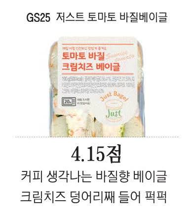반대로 여성 평가자는 높은 점수를 주고, 남성 평가자는 중간점을 준 상품도 있었다. GS25 저스트토마토바질베이글(4400원)이다. 이 상품은 베이글 안에 크림치즈와 반건조 토마토, 바질 페스토를 넣어 완성됐다. 상품 이름을 모른 채 베어 물어도 바질을 활용했는지 알 수 있을 정도로 향이 강하게 올라온다. 크림치즈는 물기가 많지 않고, 입안에 오래 남는다. 요즘 말로는 '꾸덕하다'고 표현할 수 있다.