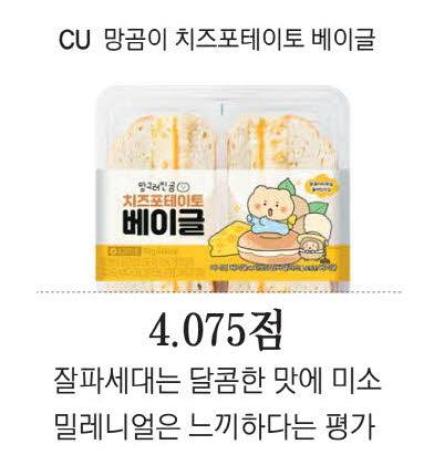 세대별 평가가 다른 상품도 있었다. CU 망곰이 치즈포테이토 베이글(4900원)이다. 잘파 세대(1990년대 중반~2010년대 초반 출생)인 김금이·박홍주 기자는 각각 개인 최고점인 4.6점과 4.7점을 줬다. 반면, 밀레니얼(1980년~1990년대 초반 출생)에 해당하는 김규식·이효석 기자는 3.5점이라는 개인 최저점을 줬다.