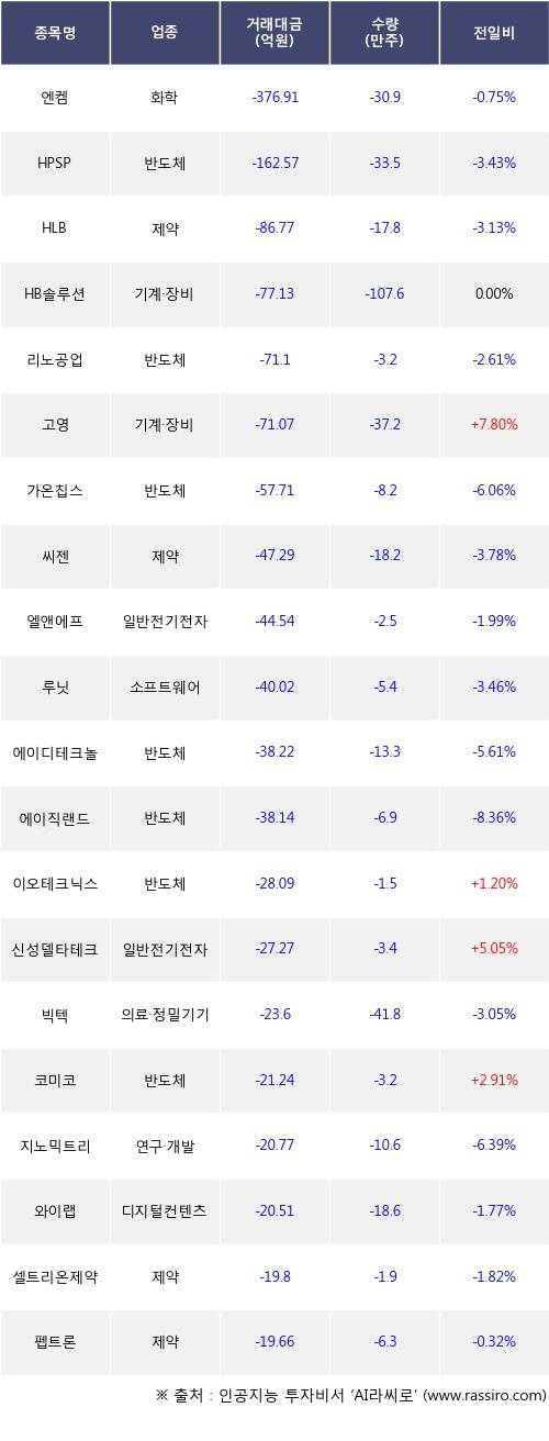 외국인 투자자의 순매도 상위 20개 종목은 엔켐, HPSP, HLB, HB솔루션, 리노공업, 고영, 가온칩스, 씨젠, 엘앤에프, 루닛등이다.