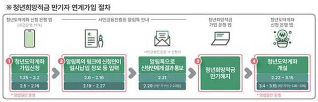 계좌개설이 가능하다고 안내받은 청년은 은행 앱에서 청년희망적금을 만기 해지한 뒤 연계가입 신청 시기에 맞게 다음달 22일∼3월 15일 청년도약계좌를 개설하면 된다.