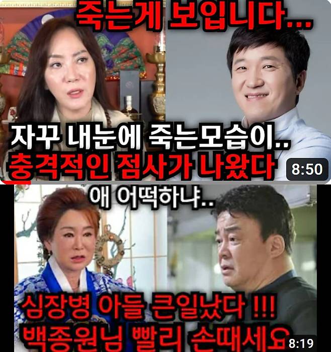 다른 무속인은 '백종원 심장병 아들 위험합니다'라는 제목의 영상에서 "쓸데없는 고집과 월권 행위로 아픔을 만든다. 여기저기서 미움을 받는다. 그 아픔은 자손에게 옮겨진다"고 말했다. 이외에도 '이동건 숨겨둔 아들 있다', '아이유 뒤에 무당 자살귀로 보여' 등의 영상이 존재하고 있다. 또 이선균, 강경준 등 연예계 사건 사고가 일어나면 그거에 대해서도 근거 없는 말들이 역술인의 입을 통해 쏟아지고 있다.