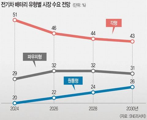 성장 둔화기에 접어들면서 배터리 회사의 전략에도 변화가 감지된다. 급성장기 국내 배터리 3사는 각형(삼성SDI) 원통형(LG에너지솔루션, 삼성SDI) 파우치형(LG에너지솔루션, SK온) 등 각각 강점을 지닌 배터리 개발에 뛰어들며 프리미엄 시장을 고집했지만 이제는 가격 경쟁력 우위의 보급형까지 포트폴리오를 확대하는 게 대세가 됐다.