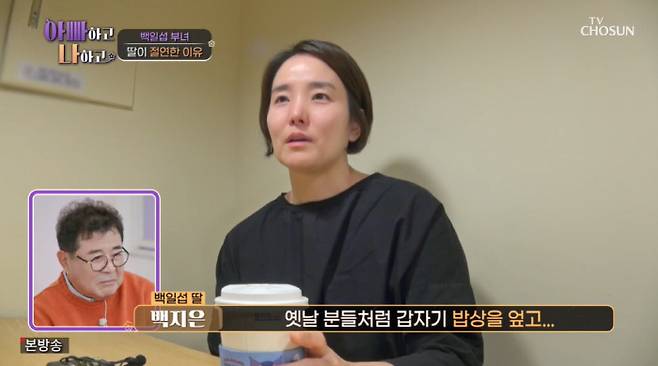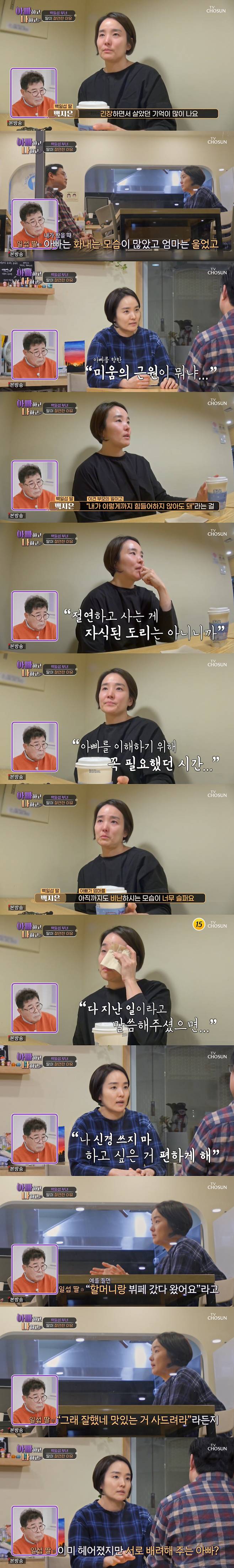 [스포츠조선닷컴 정안지 기자] 아빠의 졸혼 이후 7년간 절연했던 백일섭의 딸이 솔직한 마음을 털어놓으며 눈물을 흘렸다.