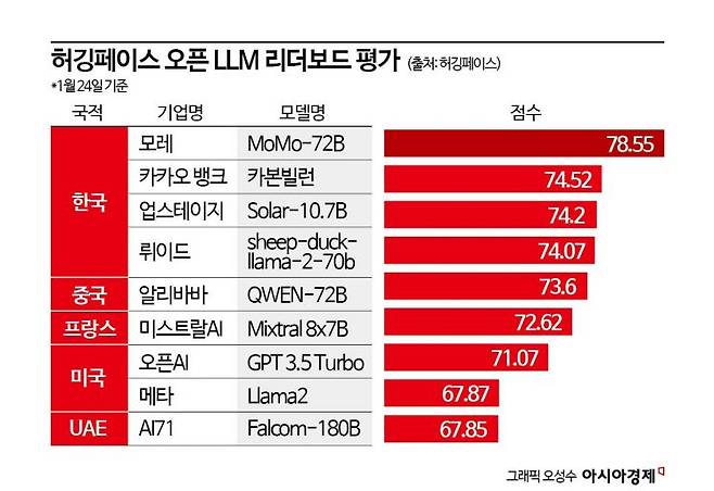 24일 기준 허깅페이스 오픈 LLM 리더보드를 보면 국내 AI 스타트업 모레는 자체 LLM ‘MoMo-72B’로 1위(78.55점)를 차지했다. 지난 18일 이보다 파라미터(매개변수)가 작은 ‘MoMo-70B’로 1위(77.29점)에 올랐다가 새 모델로 점수를 경신했다. 정보를 학습하고 기억하는 역할을 하는 매개변수는 크기가 클수록 성능이 좋다. 현재 모레가 개발한 LLM은 허깅페이스 1, 3, 10위를 차지했다.