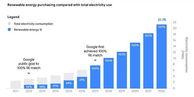 | ▲ 구글의 재생에너지 전환 목표와 현황. 2017년에 이미 목표를 달성한 후 계속 유지하고 있습니다. |