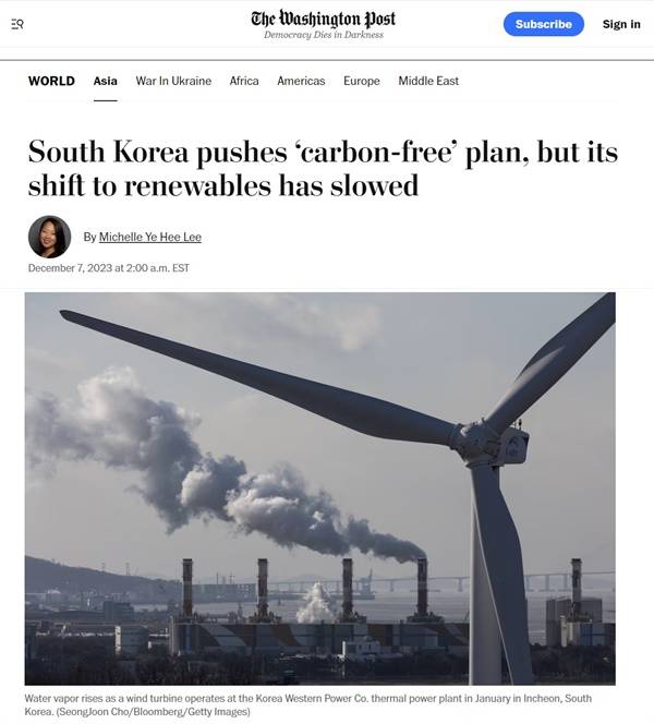 | ▲ 우리 정부가 유엔기후변화협약 당사국총회(COP28)에서 ‘CFE 이니셔티브’ 추진을 홍보하자 워싱턴포스트는 재생에너지로의 전환을 우려하는 비판 기사를 내놓았습니다. |