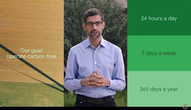 2017년에 이미 전 세계 어느 글로벌 기업보다도 먼저 RE100을 달성한 구글은 기후변화에 대응하기 위해 더 큰 목표를 세웁니다. 24시간 연중무휴로 가동되는 구글의 데이터센터에 필요한 전력 모두를 무탄소 에너지로 충당하겠다는 겁니다.