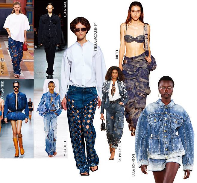 데님은 시즌을 가리지 않는 타임리스 트렌드의 상징이라 더 이상 뭔가 새로울 것이 있을까 싶기도 하다. 하지만 도전 정신을 불태운 패션 하우스들이 이번 시즌 전위적인 스타일을 선보였다는 사실. 특히 팬츠에 포인트를 준 룩이 많았는데, 예술적 미학을 데님에 풀어낸 발렌티노와 스텔라맥카트니의 팬츠는 주목할 만하다. 도트와 플라워라는 클래식한 패턴을 드레시하게 해석하고, 미니멀한 상의로 빈티지 무드를 덜어낸 것이 특징이다. 이 외에 호박을 두른 듯한 듀란란틴크와 구조적인 데님 셋업을 선보인 와이프로젝트, 포켓 디테일로 드레이핑 효과를 준 디젤이 데님 트렌드를 이끌고 있다.