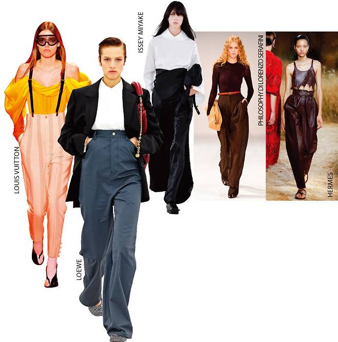 로라이즈가 유행한 게 엊그제 같은데 어느새 다시 돌아온 하이라이즈. 이번에는 팬츠 허리 라인을 갈비뼈까지 쑥 올렸다. 하나같이 모델들이 바지에 손을 넣고 있는 로에베의 런웨이를 보면 올 봄여름은 하이라이즈 팬츠가 '코어템’이라는 걸 온몸으로 주장하는 것 같다. 심지어 루이비통은 서스펜더 벨트로 슈퍼 하이라이즈의 귀환을 반겼다. 하이라이즈 팬츠를 좀 더 멋스럽게 연출하고 싶다면 얇은 벨트로 디테일을 더할 것을 추천한다. 높은 허리선으로 인해 밋밋해 보일 수 있는 실루엣에 곡선을 더하는 것은 물론, 밑위를 더욱 길어 보이게 하는 효과를 준다.