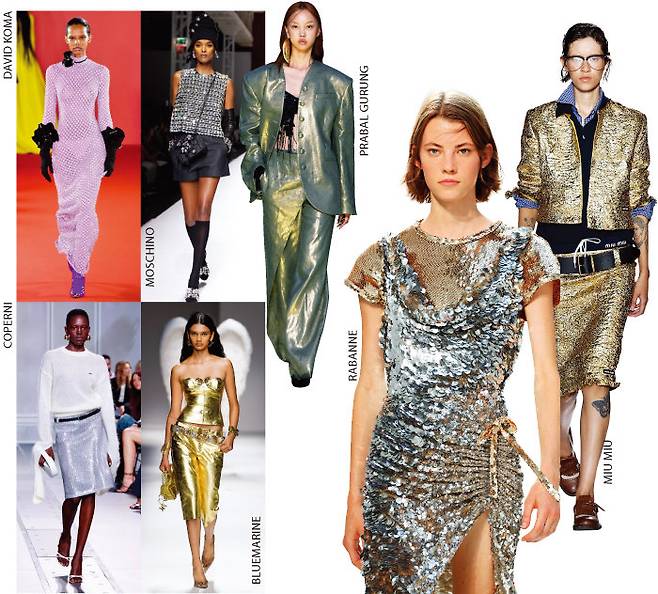 여성복 컬렉션을 주얼리 컬렉션으로 착각할 만큼 다양한 샤이닝 룩이 쏟아진 것도 2024 S/S 시즌의 특징. 골드와 실버로 압축되는 샤이닝 룩은 지난가을 인기 있었던 골드 메탈릭 룩에서 스펙트럼을 확장한 모양새다. 스팽글, 비즈, 스톤 등 반짝이는 모든 것을 드레스, 스커트, 슈트 등에 흩뿌리며 리얼웨이 룩으로 활용할 수 있는 아이디어가 다양하게 나왔다. 볼드한 크리스털 슬리브리스 블라우스에 블랙 쇼츠를 매치한 모스키노, 은은하게 빛나는 펜슬 스커트 룩을 선보인 코페르니와 미우미우, 움직임에 따라 오묘한 빛을 내는 오버사이즈 슈트 룩을 연출한 프라발구룽의 스타일을 눈여겨보자.