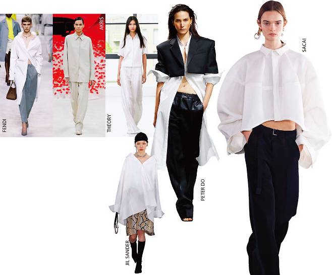 셔츠의 등장이 시사하는 점은 1990년대 미니멀리즘의 유행이 다시 시작된다는 사실이다. 화려한 컬러와 디테일, 패턴을 걷어낸 과거의 미니멀리즘은 극도의 절제미가 압권이었다면 20여 년 만에 셔츠로 돌아온 미니멀리즘은 비대칭 실루엣, 드레이핑, 시스루처럼 변화된 요소를 발견하는 재미가 있다. 2024년 식 롱 셔츠 스타일링을 제대로 보고 싶다면 피터두, 볼륨감 있는 블라우스의 사랑스러움을 확인하고 싶다면 사카이 런웨이를 살펴보자. 워크 웨어의 정석을 보여준 펜디의 룩도 놓칠 수 없는 스타일. 그래도 미니멀리즘은 이름대로 간결해야 한다고 생각한다면 띠어리와 아크리스의 런웨이에서 향수를 느낄 수 있다.