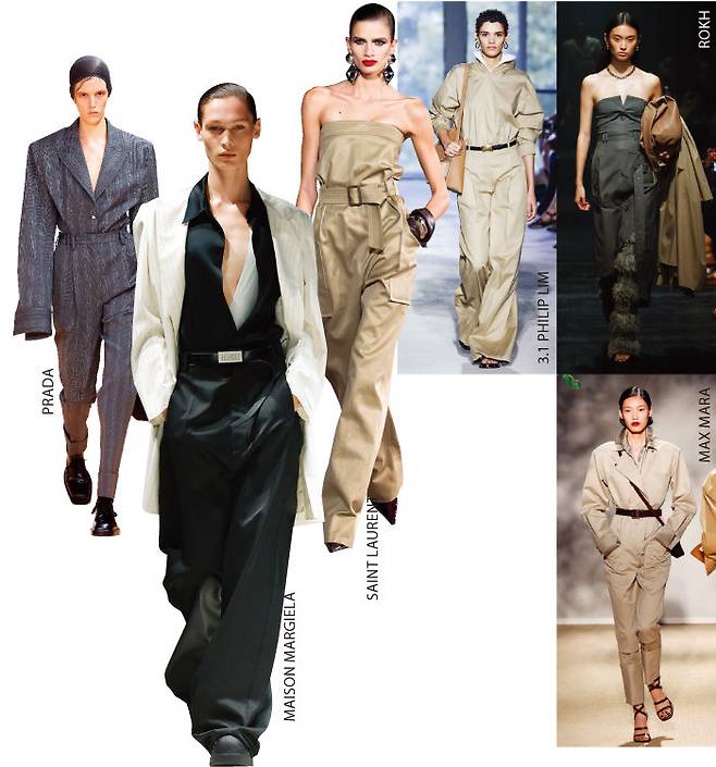 성별 구분이 의미가 없어진 패션계에서 젠더리스를 트렌드로 꼽는 것은 특별한 일이 아니다. 그럼에도 새로운 시즌이 시작될 때마다 각각의 패션 하우스가 해석한 젠더리스 룩을 살펴보는 건 늘 흥미롭다. 이번 시즌에도 과장된 어깨와 넉넉한 실루엣, 엄숙할 만큼 정제된 무드를 공통분모로 삼은 매스큘린 디자인이 런웨이에 올랐다. 그중 사람들의 시선을 빼앗은 건 점프슈트. 무심한 듯 강인한 매력을 강조한 아이템처럼 보이지만 지극히 여성적인 것이 특징이다. 흘러내릴 것 같은 실루엣이 오히려 숨겨진 곡선을 강조하기 때문인데, 이번 시즌 점프슈트는 생로랑과 메종마르지엘라 스타일링을 참고하면 실패하지 않을 것이다. 벨트, 앞코가 뾰족한 스틸레토 힐 또는 청키한 슈즈, 볼드한 액세서리 이 3가지만 기억하자.