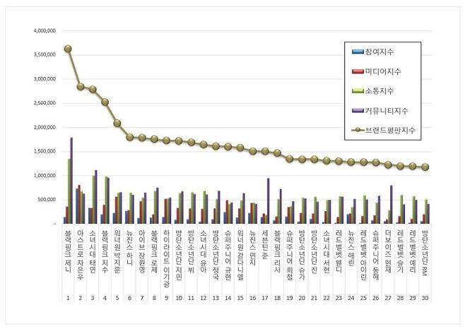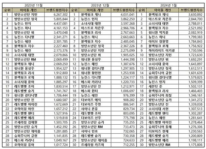 2024년 1월 아이돌 개인 브랜드평판 30위 순위는 블랙핑크 제니, 아스트로 차은우, 소녀시대 태연, 블랙핑크 지수, 워너원 박지훈, 뉴진스 하니, 아이브 장원영, 블랙핑크 로제, 하이라이트 이기광, 방탄소년단 지민, 방탄소년단 뷔, 소녀시대 윤아, 방탄소년단 정국, 슈퍼주니어 규현, 워너원 강다니엘, 뉴진스 민지, 세븐틴 준, 블랙핑크 리사, 슈퍼주니어 희철, 방탄소년단 슈가, 방탄소년단 진, 소녀시대 서현, 레드벨벳 웬디, 뉴진스 해린, 레드벨벳 아이린, 슈퍼주니어 동해, 더보이즈 현재, 레드벨벳 슬기, 레드벨벳 예리, 방탄소년단 RM 순으로 분석됐다.