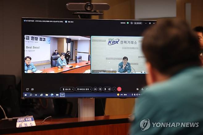 (서울=연합뉴스) 강민지 기자 = 최남호 산업통상자원부 2차관이 25일 서울 마포구 한국중부발전 서울발전본부에서 겨울철 전력수급 현장점검을 하며 전력거래소와 화상회의를 하고 있다. 2024.1.25