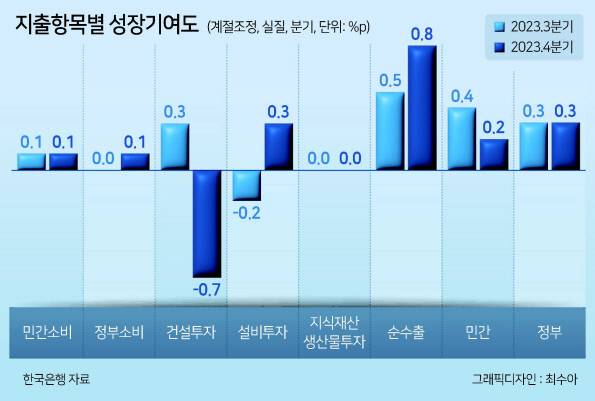 이형석 현대경제연구원 연구위원은 이에 대해 “전체 기여도만 보면 지난해 저성장은 중국 및 반도체 수출 부진에 따른 것으로 보인다”면서 “다만 작년 상반기 이후 고금리로 인한 소비 부진과 투자 부진이 지속되면서 국내 경제 하방압력으로 작용했다”고 설명했다.